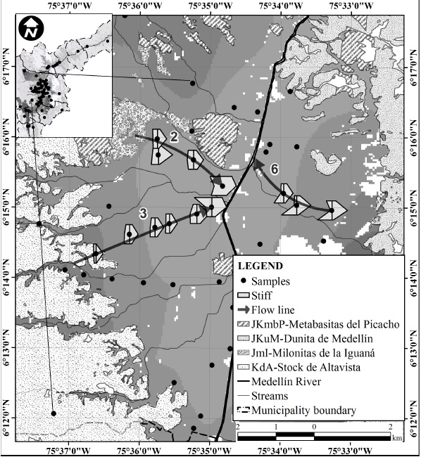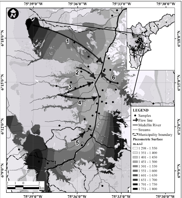 To validate the flow directions that exist in the Aburrá Valley and to find the relationships inside the water circulating in the system, the piezometric surfaces obtained in the RedRío Phase IV project [27] were used. Six lines of flow which respond to different patterns of evolution allowed its definition. Figure 9 shows the flow lines and the points where water samples were taken to perform the hydrogeochemical and isotopic analysis.