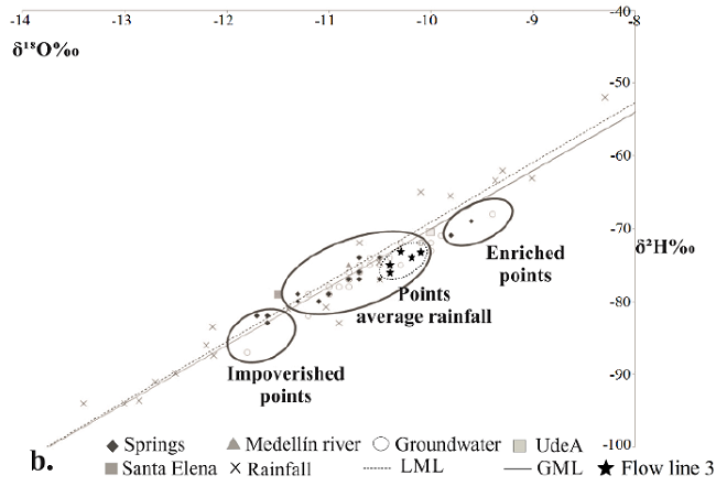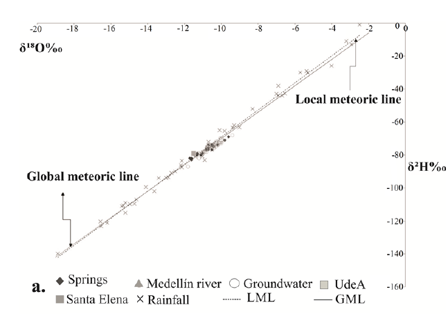 Hydrogeochemistry and isotopy constitute methodologies for testing water sources and routes. Samples are taken of water sources that are put under hydrogeochemical isotopic analysis [22] to track flow routes. In the hydrogeochemical analysis, Piper diagrams are used to chemically characterize the water and to establish a tentative approximation of its origin and degree of evolution from interaction between water and rock along a flow line. In the isotopic analysis, a local meteoric line -LML- is defined with at least one year of monthly isotopic information, and the possible sources of recharge are defined on a graph δ18O vs. δ2H