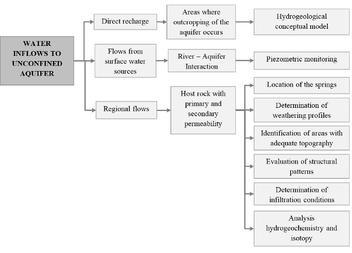 The identification and characterization of natural water flows that contribute to the recharge of an aquifer are indispensable for an adequate understanding of the size and availability of the water as a resource. Thus, there are various techniques that permit the estimation of the boundary conditions that allow the ingress of water. Figure 2 shows a conceptual diagram of the techniques that allow identifying the three kinds of natural water contributions to a free aquifer. The first corresponds to direct recharge areas that can be estimated by locating those places where outcropping of the aquifer occurs, and that are determined by hydrogeological exploration. A task that is part of the conceptual hydrogeological model. Secondly, we have areas that allow the flow of surface water to a hydrogeological unit and that can be estimated through piezometric monitoring, which gets the measurements of the groundwater level through time, and by inspection and comparisons of piezometric surfaces that allow determining possible interactions between surface water and groundwater. Finally, regional flows depend on the host rock, its primary and secondary permeability. Of the three forms of recharge, the latter has been shown in the context of regional flow systems [15]; however, it has hardly been evaluated or documented. It is particularly complex and it depends on multiple variables such as: the presence of springs, the characteristics of the weather profiles, terrain geomorphology, structural patterns and infiltration conditions. The use of hydrochemical and isotopic tracers permits verification of these flow routes. On a regional level, the areas that facilitate this type of recharge are extensive. These recharge areas by regionals flows influence the quality of the water that flows into the aquifer considerably. This is due to the possibility that contaminants infiltrate and reach the aquifer. Consequently, regional flows must not be neglected in an assessment of the groundwater resources of an area.