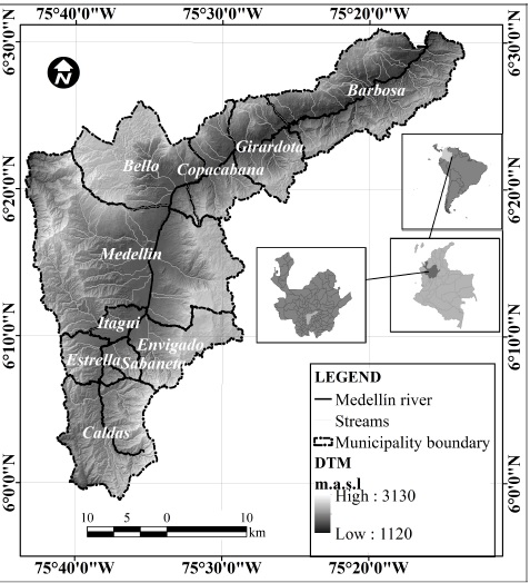 The proposed methodology has been applied in the Aburrá Valley. The Aburrá Valley is located in the Colombian Central Andes, between geographic coordinates 6°30’25’’ and 6°17’2’’ N and 75°40’5’’ and 75°13’30’’ W. It is a natural basin of the Aburrá-Medellín River, located in the middle of the Department of Antioquia. The Aburrá Valley is a mountainous domain with altitudes varying from 1,300 m.a.s.l. to 3,100 m.a.s.l., and has slopes of up to 75°. In terms of geomorphology, the valley consists of three units with different landscapes, taking into account aspects of shape, width, orientation, and physiographic context. Temperature oscillates between 16 and 29 °C and relative humidity is 70%. The region is characterized by a humid, tropical climate with an average annual precipitation of 1,500 mm.