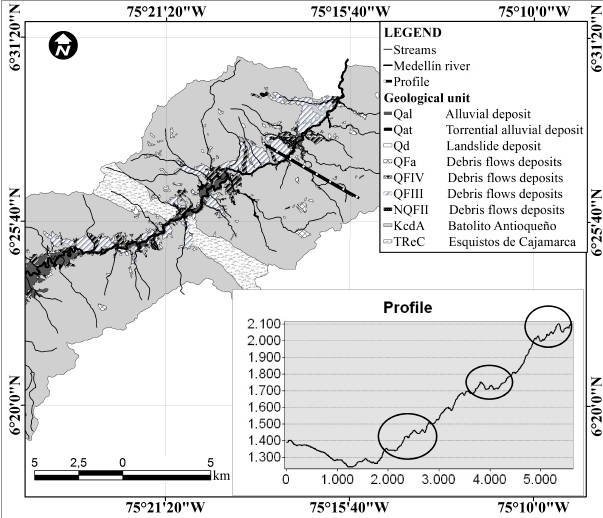 The geomorphological characteristics that have shaped the landscape of the Aburrá Valley over the distinct types of rock, as much by the effects of meteorization as by tectonics, permit the identification and localization of sectors where the relief is favorable for temporary surface storage of water, allowing later infiltration. These traits basically correspond to the high sectors of the plateau, where the shallow watershed of the Aburrá Valley is located, and to the steps in the tributaries caused by the presence of saddles or alignments of fault traces. In the cut shown in Figure 5, an example of these characteristics can be seen.