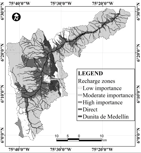 The determination of areas of recharge and regional flow systems in Aburrá Valley (Colombia) was possible by applying the superposition methodology and spatial analysis. The recharge zones were ranked in 5 categories, with direct recharge zones being the most important. For the regional contributions, four categories were defined and thereby designated as indirect recharge zones of high, medium, low or very low importance. Each condition is classified according to the ratio of occurrence of the five weighting factors.