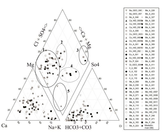 The Piper diagram in Figure 8 shows that in the Aburrá Valley, there are five different chemical configurations in the groundwater. The most representative group (1) corresponds to the magnesium-calcium bicarbonate type (young waters with low residence time and quick circulation), the second group has a chemical composition of magnesic calcium, the third group has a composition of chlorinated, sulphated sodium, a fourth group belongs to the mixed bicarbonate type, and a fifth group has a sodium bicarbonate composition (the most evolved waters).