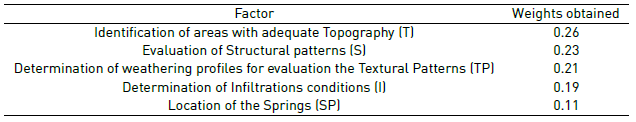 Table 1 synthesizes the weights that were obtained. According to these results, the factor with the biggest importance in defining the recharge coming from regional flows is an adequate topography which allows water infiltration. The least important factor is the presence of springs. It is worth noting that this factor (location of springs) shows that a flow exists through the geological units, but indicates a discharge of groundwater.