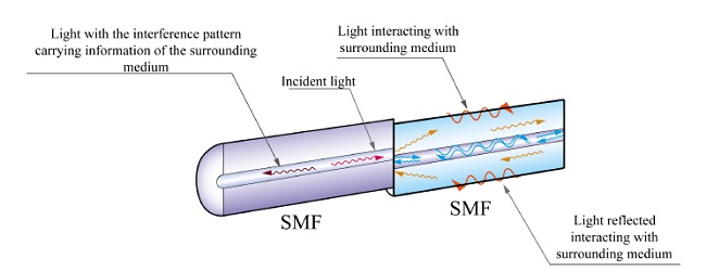In addition to the aforementioned, for an optical fiber the effective refractive indices of both the core and cladding change in a dissimilar manner when temperature changes. This effect is caused by a mismatch on the thermo-optical coefficients and thermal expansion coefficients of these two regions. Thus summarizing, OFI devices sense temperature changes as a sum of various phenomena: thermal expansion of the fiber, thermo-optical effect, and fluctuations in the RI of the surroundings; which, acting as a whole offer high sensitivity. However, all these phenomena also limit the use of each sensor to a specific environment. Otherwise, the sensor will have a different calibration curve (i.e. a different behavior) depending on the RI of the surrounding medium. This scenario becomes more complicated in cases where the RI of the external medium changes as temperature changes [12-13].