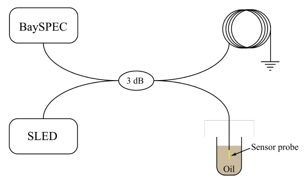 The experimental setup employed for the temperature measurement is shown in Figure 3. Light from a SLED (superluminescent light emitting diode) was launched into the optical fiber and coupled to the in-fiber integrated MI using a 3-dB coupler. The reflected spectrum was recorded with a Bayspec optical fiber interrogator [Bayspec Inc., Fremont, CA]. A Bayspec is a fiber interrogator device designed for in-the-field measurements, whereas the more sturdy and expensive OSAs (Optical Spectrum Analyzers) are more intended for research laboratory purposes.