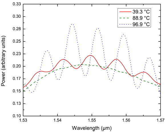 Figure 4 shows the reflected interference patterns obtained at three different temperatures from the interferometric probe configuration shown in Figure 1, i.e. without the coating. These measurements were carried out in the SAE 10W-40 oil. Two of the recorded spectra (at the lowest and the highest temperatures) showed clear interference patterns. From Figure 4, it can also be noticed that there is a sensitivity of the interference patterns to the changes in the external medium, mostly caused by the changes in the refractive index of the oil. This sensitivity can be observed through two phenomena; firstly, the amplitude of the interference patterns was smaller for the lowest temperature when compared at the highest temperature. Secondly, there were temperatures where the peaks of the interference patterns were well-defined. Both at low (39.3°C) and high temperatures (96.9 °C). However, it was found a temperature range around 89 °C where the reflected spectrum from the fiber probe distorted to the point of causing the interference peaks to disappear. These phenomena are both attributable to the interactions of light from the fiber with the surrounding environment.