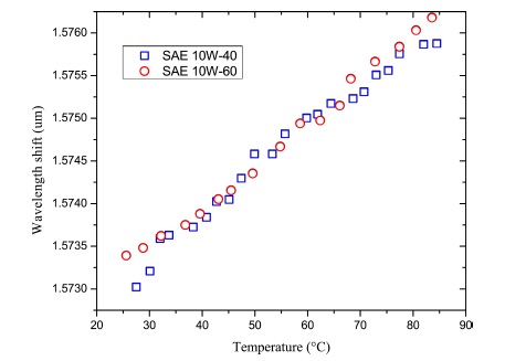 In order to prove the desensitization to refractive index changes of the gold-coated probe, its response was recorded in the two chosen lubricant oils while increasing their temperature. Figure 6 presents the wavelength shift on each case. The behaviour presented by the sensing probe showed to behave without noticeable differences despite the dissimilar environments.