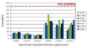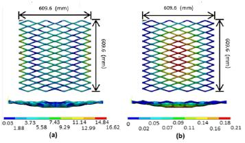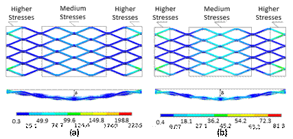During the installation, the orientation of patterns of expanded metal meshes on structural supports is important, in order to provide the best safety condition. Figure 12 shows the stress distribution and deflections for 3.14lb expanded metal mesh, which is clamped in orientation I (parallel to the long side of the pattern). It is seen, that maximum deflection occurs in the middle distance between supports, with a value of 0.26 (mm). It should be considered, that distribution of deflections occurs progressively from the clamped place to the middle of the mesh. At the same time, the maximum load is close to the clamped area with a value of 22.03 (MPa), and stress distribution has symmetry respect to a middle plane, neglecting them approximately in 0.21 of the spacing between supports.