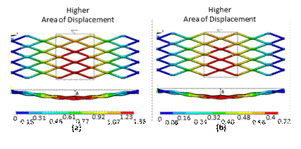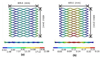 Figure 14 shows distribution of stresses and deflections in a 3.14lb expanded metal mesh fully clamped. It can be appreciated that maximum deflection occurs at the center of the structure with a maximum value of 0.21 (mm). In terms of stresses, the maximum value is 16.692 (MPa). As expected, the deflection and the stresses obtained are lower; however, both values are very close to the orientation I. This indicates that the best condition to fix the mesh (clamped) is the orientation I because it will significantly increase structural rigidity than orientation II.