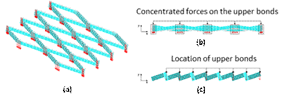 These are loads distributed over an entire gap between edges. Distributed loads were placed in bonds located at the top of the mesh. These bonds are the ones that receive the load in a real situation, representing the first contact points of weights placed in the sheets. Figure 6 illustrates the bonds location and the force application.