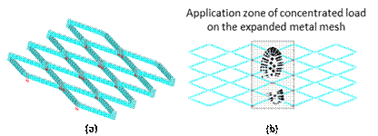 Two loading types were applied transversely to the expanded metal: uniformly distributed loads and concentrated loads. These values were obtained from the EMMA 557-15 [8]. Uniform load is the most unfavorable condition of the load, while concentrated load represents a pedestrians walking on the mesh.