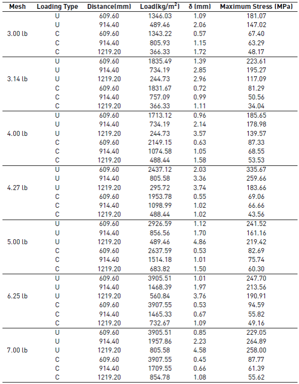 Analyzed models of expanded metal meshes, attained deflections below the maximum recommended value of 6.35 (mm). This value is only for pedestrian comfort outlined in the EMMA 557-15.