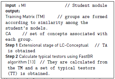 Following, there is a description in pseudo-code of the algorithms included in the proposed model for students modeling using the basic ideas of LC-Conceptual algorithm [11].