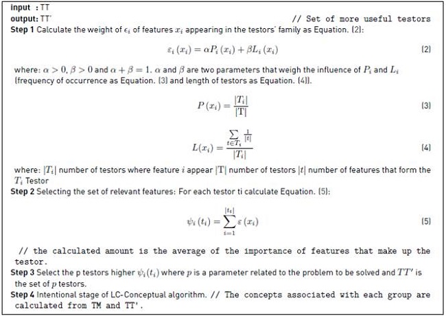 As the number of typical testors can be large, ordering is required by utility level. Several concepts can be generated out of a typical testor; they may be sufficient to characterize the students’ models that comprise them, or it may be necessary to calculate the concepts from several typical testors. Algorithm 2 illustrates Algorithm 2 for calculating the testors usefulness.