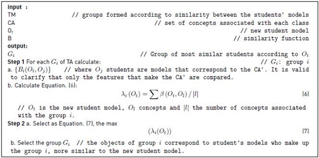 This phase implements the student modeling. Given a new student model, it is situated in the most similar group according to its characteristics. This allows adapting students features to didactic materials associated with the group. Algorithm 3, shows how to perform this process.