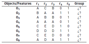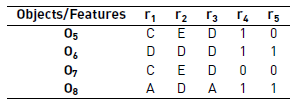Example 1. Given the array MI (student module) where Oi represent eight students’ models and ri the five features that describe them. The features r1, r2, r3 can take as values: {A, B, C, D, E}, and r4, r5 can take as values {1, 0}. When Phase 1 is completed, the TA matrix composed by two groups {I, II} is obtained. Table 1 shows the initial matrix, and Tables 2 and 3 show two groups making up the training matrix. The concepts covering the observable and unobservable objects are shown, too. For each group unobservable concepts are underlined.