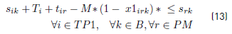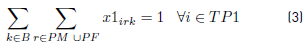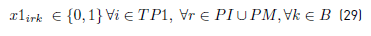 x1irk: 1 if the task i ( TP1 is assigned to bus k ϵ B starting at depot r ( PI or ending at depot r ( PM(PF, 0 otherwise.