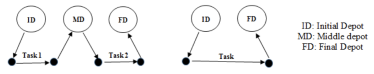 The planning period of each complete task is all day and a bus should service only one of these tasks; in the other case, a bus can serve one task (less frequent occurrence) or a block consisting of two tasks, which need to be compatible. All buses need to start and finish each task in a depot, not necessarily the same. Then, a CT is a sequence of the type: a pull-out trip, a task, and a pull-in trip. A BT is a sequence of the type: a pull-out trip, a task, two others deadhead trips (a pull-in trip and a pull-out trip, considering the same depot) a second task compatible with the first task and a pull-in trip [Figure 3].