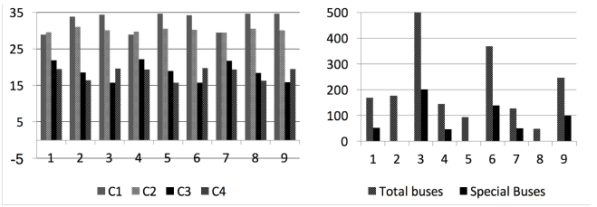 Buses per operator [Figure 5 Left, in percentage), also divided into special buses or not. Figure 5 (Right) shows total number of buses and special buses.