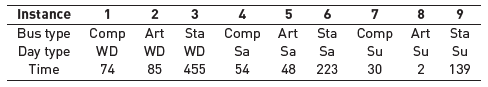 All tests were performed on an Intel Core i5-3210M 2.50GHz and 4 GB RAM. GUROBI was used for computing the solutions. Nine representative instances were generated from real data obtained from the operation of MIO System, and derived for the three types of buses, and three types of days: Working Day, any day between Monday and Friday (WD); Saturday (Sa) and Sunday (Su). Table 1 identifies each instance with the type of bus and type of day. In these types of days, the number of tasks and buses varies, in correspondence with the existent demand.