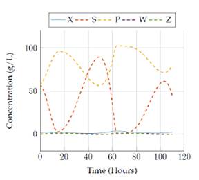Figure 1 presents the real values for the 5 states (X, S, P, W, Z) during a 110 hour simulation of the Zymomonas mobilis system: