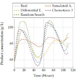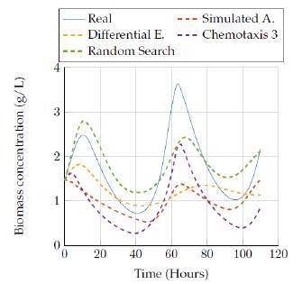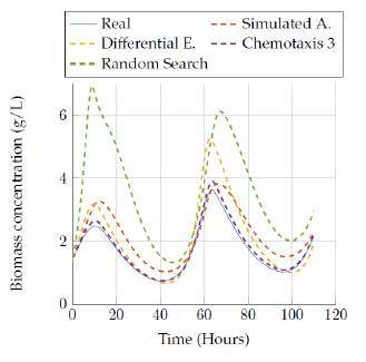 Figures 9 and 10 show the comparison of the results obtained by the best four heuristic methods in the biomass state. It is possible to see that simulated annealing and version 3 of bacterial chemotaxis provide good results for the 3 hours run. Also, a pattern in this state regarding the behavior of the estimated values is observed, since a lower run time gave us solutions below the real data, but increasing the run time gave us behaviors above the real data.