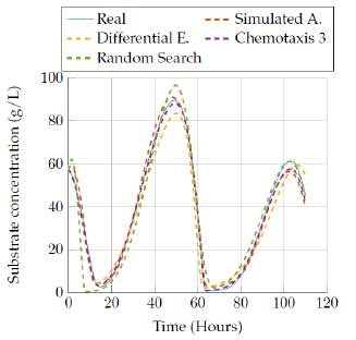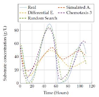 Then, figures 11 to 12 show the comparison of the results obtained by the four algorithms in the substrate concentration state, where it can be seen that the random search algorithm and the last version of the chemotaxis algorithm provided a really good approach whereas Simulated annealing and differential evolution lost accuracy when trying to represent this state with a low execution time. Moreover, a really good estimation was obtained after 3 hours of execution, since those algorithms fit very well the model behavior as it is seen in figure 10.
