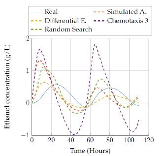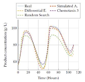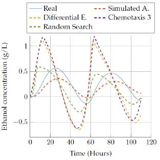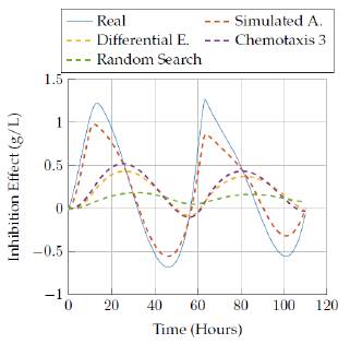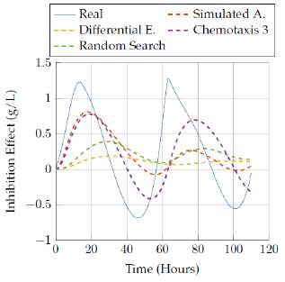 Therefore, the algorithms that provided a better performance regarding their objective function, their efficiency and how well they fit the real system, were the bacterial chemotaxis algorithms. This is because of the criteria that these algorithms must follow, when looking for solutions: their criteria allow them to explore quickly a large number of solutions, and thus they can improve the quality of the best found solution very frequently. Bacterial chemotaxis has a great advantage against all other algorithms in the short execution time of 5 minutes, and a slight advantage over other techniques like local search based and differential evolution in the 3 hours execution (we should also note that in this 3 hours execution, results obtained with the parameters estimated by version 3 of the bacterial chemotaxis were very good and almost identical to the real model).