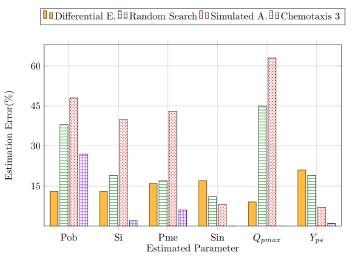 Another way to analyze the algorithms performance is calculating their estimation error. For this aim, we took into account the real value of the parameters [Table 1] and calculated the relative percent error for the list of parameters. In this task, we noticed that the estimation skills of the heuristics vary depending on the parameter, which might be due to the different ranges of the parameters. In figure 19 we showed the percentual estimation error of six of our parameters in order to see the general performance of the algorithms in this model. As it can be seen, the chemotaxis 3 was the algorithm with the lowest estimation error in this group of parameters; it was even the heuristic with the closest estimations to the real values in the simulation of the states. However, for some parameters, the chemotaxis 3 did not have the best estimation, as it can be seen for the parameter “Pob”. Differential evolution had the lowest error for estimating the “Pob” parameter. In general, the heuristic estimation errors are under the 50%, which is acceptable considering the good results of the simulations with the parameters estimated.