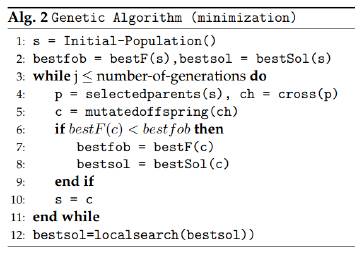 A genetic algorithm [13] is an heuristic method that belongs to those called population heuristics. In this kind of techniques, a population of solutions is used to produce and obtain new solutions that may provide a better objective function value for the problem. In a genetic algorithm, first an initial set of solutions is created, and this will represent the first generation of the algorithm. In this case, that first set of solutions is constructed in a completely random way. The next step is evaluating the objective function for each of these solutions (the best one of them is stored), and then using a selection criteria to choose which are the solutions (“parents”) that will be used to create new solutions (“offspring”). Usually, good solutions are selected more frequently than bad solutions.