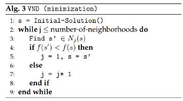 The variable neighborhood descent algorithm [14] is found on the set of local search algorithms: it starts with an initial solution and creates a neighborhood for it. Then, among all possible solutions contained in the neighborhood, it finds the first solution that has a better objective function value than the initial one, and this one is saved as the best solution. Then, for the new current best solution, a new neighborhood is generated and the previous process is followed iteratively until the stop criteria is reached.