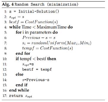 Random search algorithms have proved to be efficient for parameter estimation problems in the literatura [15]. This version of the random search algorithm is not as random as the name implies: the algorithm does a kind of local search but with a random factor. It starts from an initial solution and within each iteration it modifies only one of the parameters of the solution. If this alteration improves the objective function, then the best solution is updated. Then it goes further by modifying the next component of the solution in the next iteration, and it repeats the process for all the components of the solution.