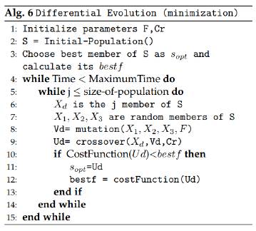 The differential evolution version that has been implemented was taken from [17]. According to this method we must consider the following parameters: F =mutation ratio, F ϵ (0; 2), Cr =crossover ratio, Cr ϵ (0; 1), kmax =number of search iterations or maximum execution time.