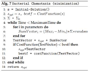 The bacterial chemotaxis algorithm [18-20] makes a random walk and moves towards the gradient of sugar concentration. It also has a Σ parameter which weighs the movement amplitude. This heuristic technique is applied by executing the following steps: