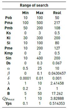 For each of the parameters that we needed to estimate, we defined arbitrarily a minimum and máximum posible values to limit the solution space, based on the scales of their values in the real model (it is clear that the real value of each parameter is therefore contained within this interval, that is between the minimum and máximum possible). It is important to mention that all of these parameters are continuous. Predefining these searching ranges for the parameters allows a fair comparison between the results obtained by the different heuristic methods, as seen in the literature [11].