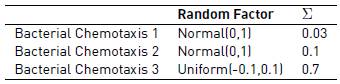 In this study, we consider three different versions of the bacterial chemotaxis algorithm, in which we vary both the distribution of the random factor and the value of the Σ component. Table 2 shows the characteristics for each version of the bacterial chemotaxis algorithm.