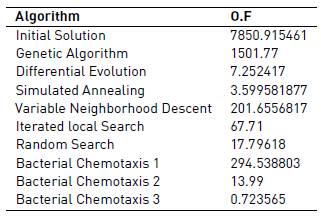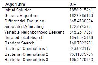 Bacterial chemotaxis algorithm is a method based on a simple technique (disturbing each parameter of the solution in each iteration), and with this methodology we can explore the space of solutions. This technique has a very good performance for both long and short times (this heuristic allows us to evaluate many different solutions very quickly, therefore allowing us to find very good solutions in a short time).