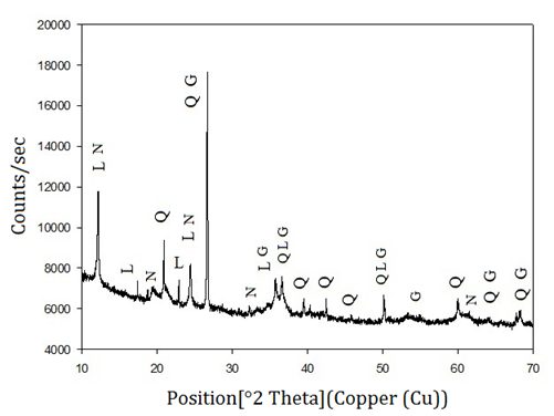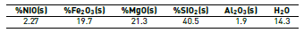 Figure 1 shows the X-ray diffractogram, which indicates the presence of lizardite (H4Mg3O9Si2), Nepouite (Ni3Si2O5(OH)4), iron as Goethite (Fe2O3.H2O), and quartz (SiO2).