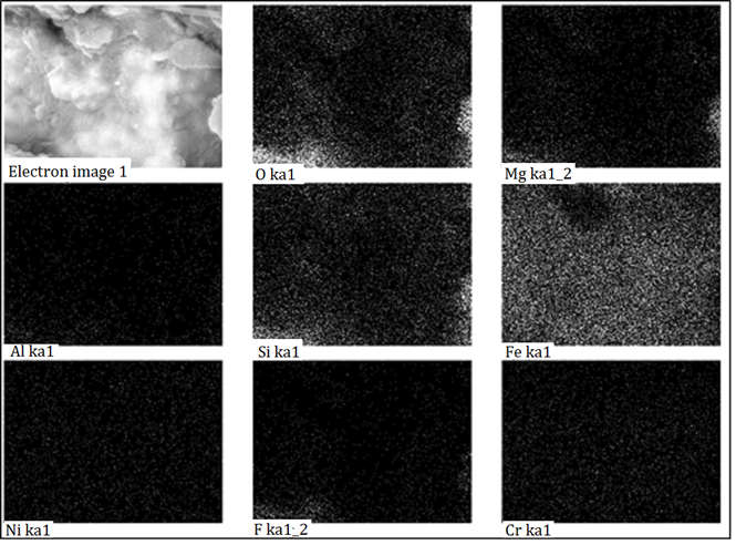 The SEM analysis shows that nickel is associated with silicon in form of silicates, as shown in the diffractogram in Figure 1. Figure 2 shows the SEM mapping.