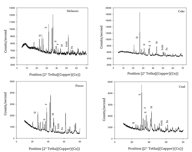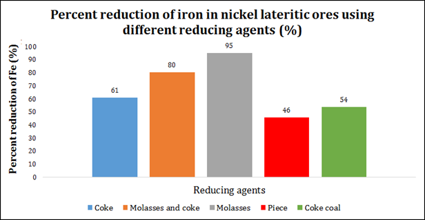 It can be concluded from the X-ray diffraction and atomic absorption results that molasses is an organic material that can be used as a reducing agent, based on the decomposition reaction that occurs when subjected to high temperatures. In addition, it has properties as a binder. As a binder, coal has good properties of plasticity which helps the particles to agglomerate more easily. Coal as a reducing agent has a reduction of 54%, which is not favorable for this type of processes. Coke is not a good binder, but should not be discounted as a reducing agent; it showed a reduction rate of 60%, considering that is reactive at high temperatures. If used in excess, it can function as a good solid reducing agent and can be a good alternative in the process of reducing this type of lateritic nickel ore.