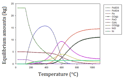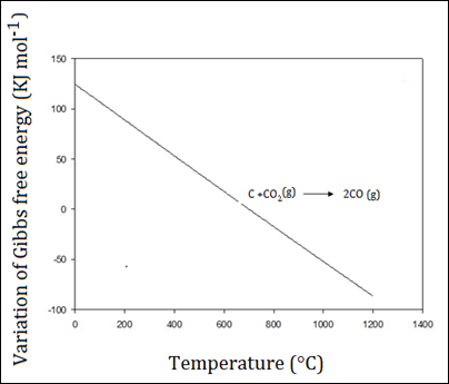In direct reduction processes of iron ore and nickel, the Boudouard reaction is important because the gaseous reducing agent that is formed is CO (g). This can be seen in Figure 4, in which the formation of CO (g) and its stability is shown to occur above 1000 °C.