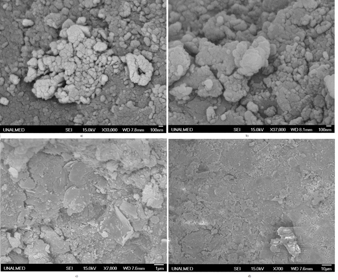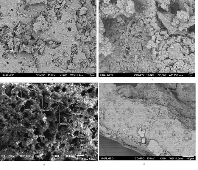 The atomic absorption results show that this is one of the reducing agents with better reduction results of, and it can be concluded that molasse, in addition to having good binding properties, is an excellent reducing agent; slight porosity is clear in the figure. Figure 8 b) shows a reduced coke briquette, in which the mineral particles are not sufficiently porous, meaning that the reducing gas did not have the same effect as with the molasses. Figure 8 c) shows the reduction of the ore sample reduced using coke coal; is observed to be porous, indicating that the reducing agent was in contact with the agglomerates, although the results of atomic absorption show that the percentage reduction is not sufficient to ensure that this is a good reducing agent. Figure 8d) shows a piece of ore that was reduced under the same conditions, but without a reducing agent passing through the sample; it obtained a reduction of 46%.