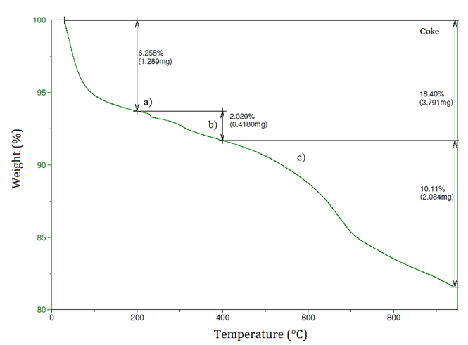 The TGA results show that the ore changes with increasing temperature. Coke, coal, and molasses mixed with ore lose mass as the temperature increases. The mix with ore and coke is subject to an 18% loss in weight, as shown in Figure 9. In the figure, part a) shows a transformation at 200 °C, which in this case is the transformation of goethite; part b) shows the transformation of iron oxides (magnetite and wustite), and part c) shows the formation of iron and nickel alloy.