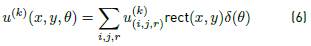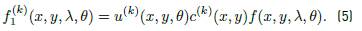 = 1,…,K, which applies spatial modulations to the scene. Ideally, u and c are binary functions, the blocks blocking or not the passing of voxels in the 4D data cube. In this way, the spatial, spectral and polarization modulated scene is obtained as in Equation (5)