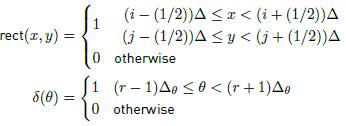 are the 2D and 1D sampling functions respectively, Δ is the sample pixel size which is assumed equal for the micro-polarizer array, the coded aperture and the images and Δθ is the sample angle. The discrete form describing the modulation of the scene given in Equation (5) is expressed in (9) as:
