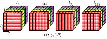 Spectral polarization images can be modeled as a 4D structure, shown in Figure 1, where each 3D image represents the scene at one of the four polarization angles (0°, 45°, 90°, 135°). This representation does not modify the spatial structure of the scene. One of the most common ways to represent polarization is by means of the Stokes parameters S. These are four vectors that describe partial or total polarization of light based on intensity measurements [15]. Stokes vectors are defined in terms of optical intensity as follows: S0 is the total intensity of a scene, S1 is the difference between the intensity along the x (0°) axis, and the one oriented parallel to the y (90°) axis, S2 is the difference between the linear +45° and -45◦ polarization and S3 is the difference between the intensity transmitted by a right circular polarizer and a left circular polarizer [16]. In the majority of applications, the S3 component is not used; additionally, sensing S3 requires an additional quarter-wave plate [17], which is not considered in this work. For this reason, it is typical to work with only the first three Stokes vectors, which have a linear relationship with the measurements of the traditional detectors. These are given in Equations (1), (2) and (3) as follows