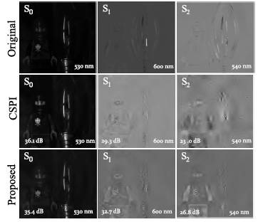 To visualize the reconstruction quality, the reconstructed Stokes images plane in four spectral channels for 10% of compression are displayed in Figure 10 for both architectures. The reconstruction shows significant image quality compared to CSPI.