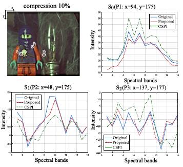 In order to verify the spectral accuracy of the proposed architecture, three spectral points of the original data cube are compared with the reconstructed signatures. In Figure 11 the results are presented. In general, the results show that the proposed architecture presents better spectral performance than CSPI.