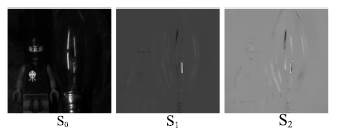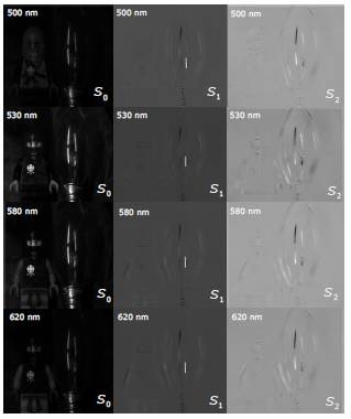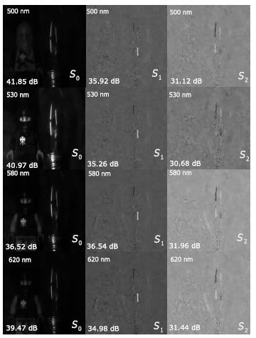 The linear polarization information is obtained by Eqs. 1, 2 y 3. Figure 8 shows the Stokes parameters for four different wavelength. The second and third Stokes parameters represent the linear polarization state. In the 4D array of data, a toy and a bulb can be seen, each with different textures and shapes. With this four-dimensional data cube, simulations can be performed using Equation. 15 without additional noise.